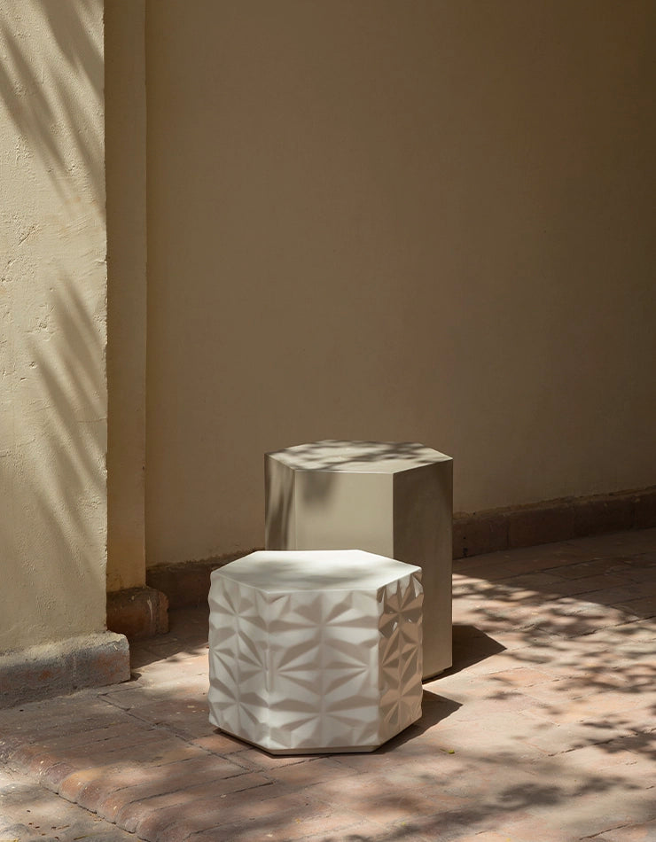 Experience dimensional design with the "HEX 3D" table. Its subtly faceted form adds sculptural intrigue to your space while staying compact and functional.