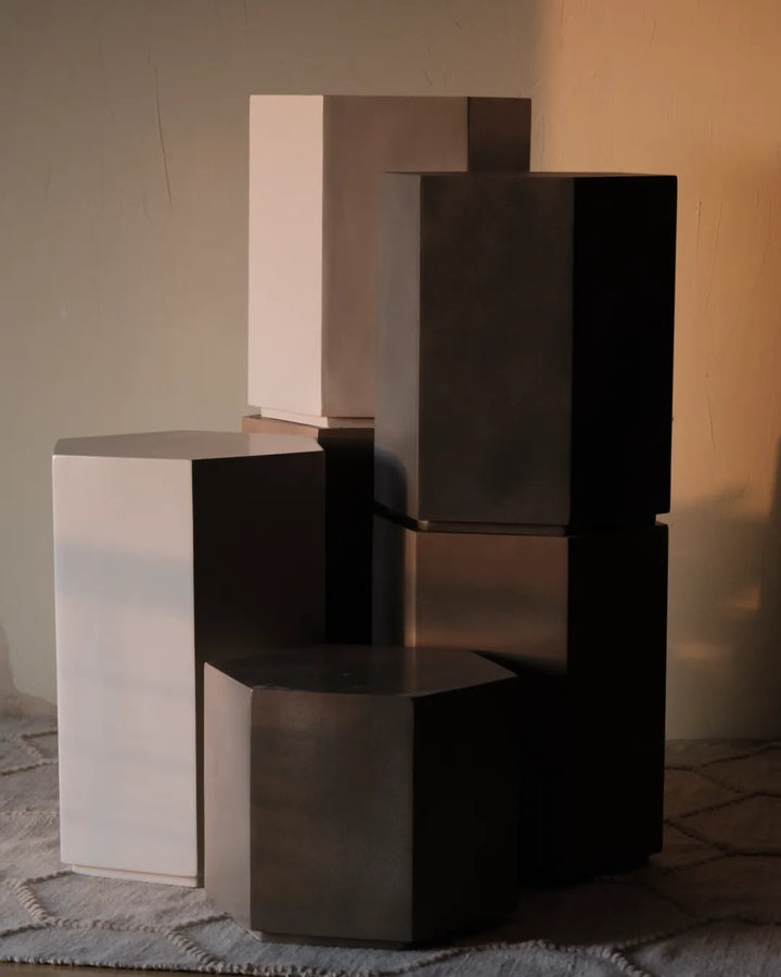 Bring balance and bold personality into your living space with the Hex Table "My Big Sister". Crafted from fiber glass and standing tall at 55 cm, this sculptural piece pairs strength with elegance. Its hexagonal form invites geometric harmony, while its size makes it a perfect companion for sofas or beds.